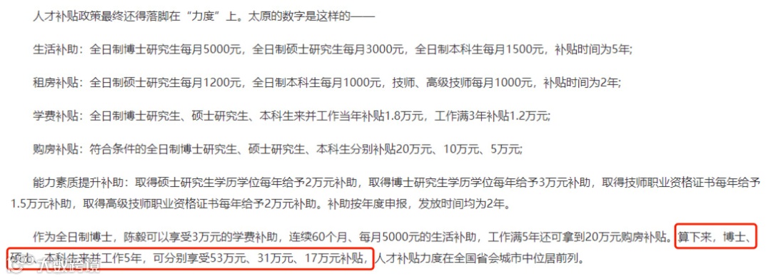 12月2日,太原市公布了引进高层次专业人才的补助政策。算下来,博士、硕士、本科生去太原并工作5年,可分别享受53万元、31万元、17万元补贴。不同学历,差异显著。