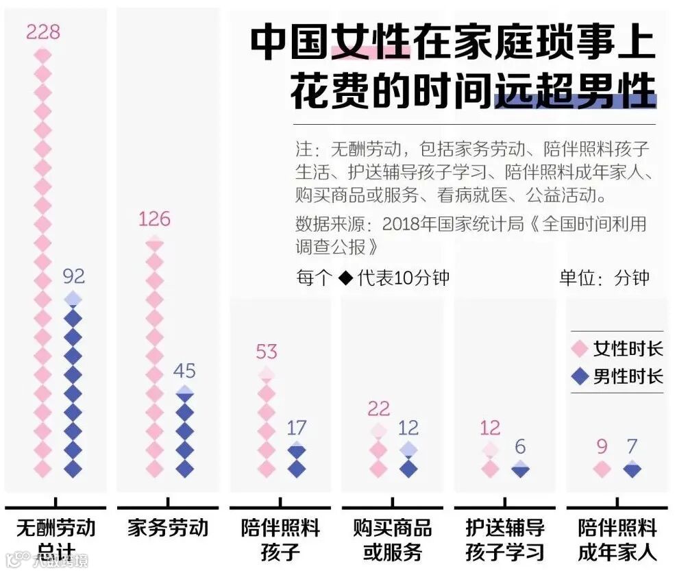 有数据表明,在打扫家务、陪伴孩子和护送辅导孩子学习这些项目上,女性投入了男性两倍或以上的时长。女性平均每天花在家庭琐事上的时间超过 3 个小时,是男性的两倍多。