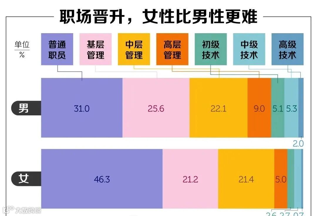 身为普通职员的女性比男性高出 15%,而担任管理人员和技术人员的女性占比都远不如男性。