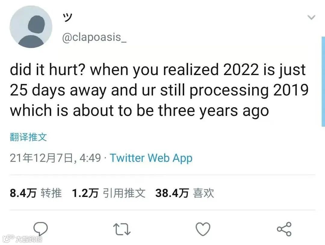 前两天这样一条推文的截图突然火遍了微博,原文的大意是:“令人扎心的是,当你意识到距离2022还有25天时,你还在怀念2019年发生的事,然而这几乎已经是三年前的事。”