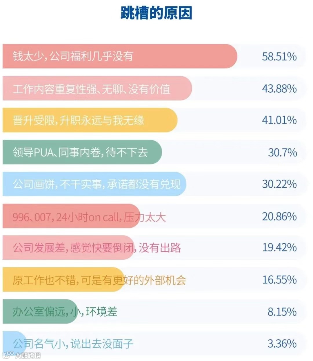 根据数据来看,我也总结了以下几点原因,当然还有其他的跳槽原因,大家可以留言详细说明。
