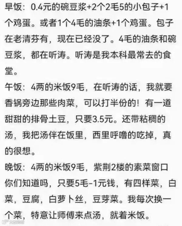 文中的很多生活细节,具体到早中晚餐在哪个食堂花费了多少钱?相信和我一样穷过的人,很能够感同深受。上学的时候,钱要怎么花?花在什么地方?每一笔都要算的很清楚才能够用,或者这样才能省下钱买到自己想要的东西。