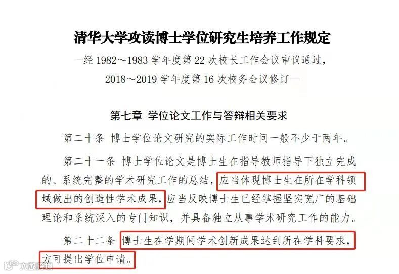 这一规定也在学校方得到贯彻,如清华大学2019年修订的《攻读博士学位研究生培养工作规定》要求:博士生在学期间学术创新成果达到所在学科要求,方可提出学位申请。