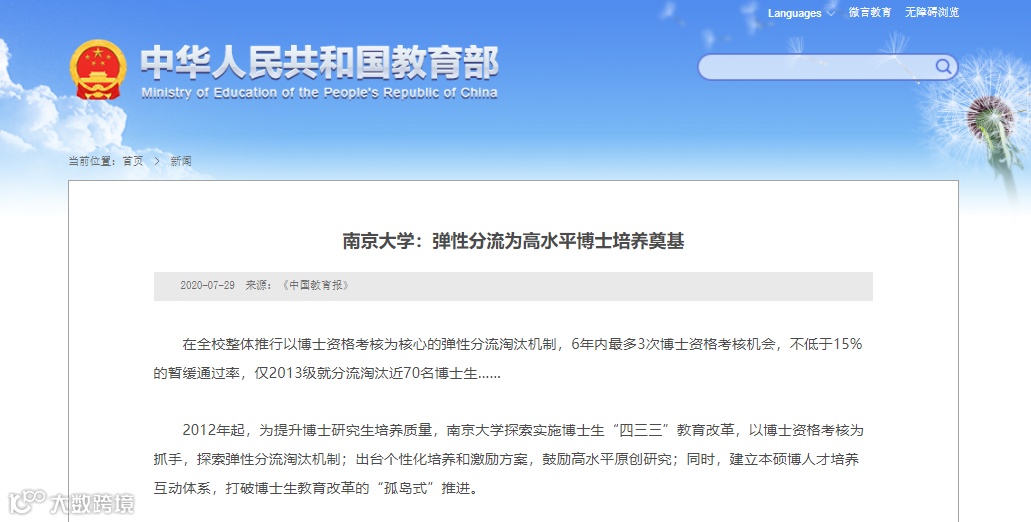 如2017年教育部推出博士研究生教育综合改革试点工作,鼓励北京大学、清华大学等14所试点高校尝试探索分流淘汰机制,努力提升博士生培养质量;