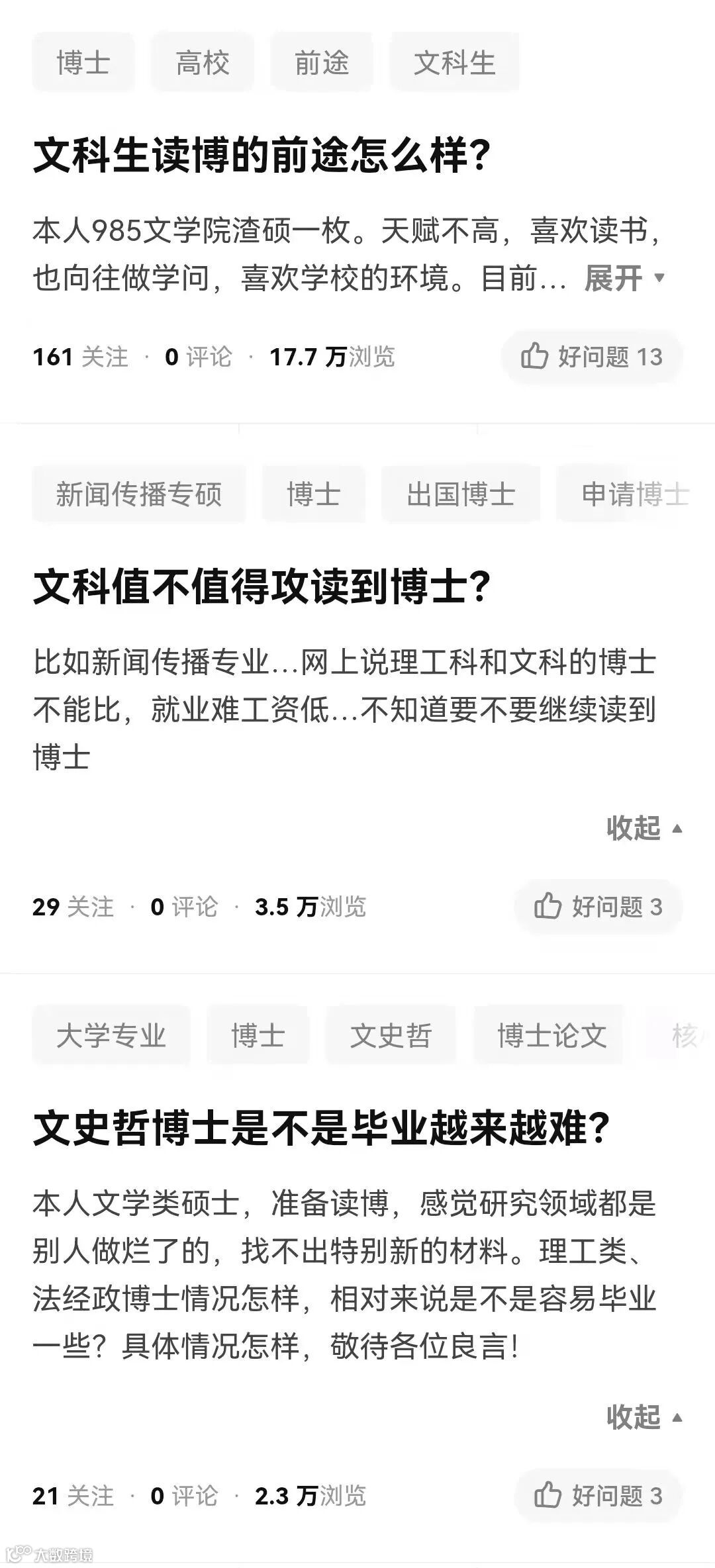 近几年关于“文科生读博”之类的舆论层出不穷,迄今为止,文科生读博相关的话题,也在知乎、豆瓣等各大平台引发了大量讨论。