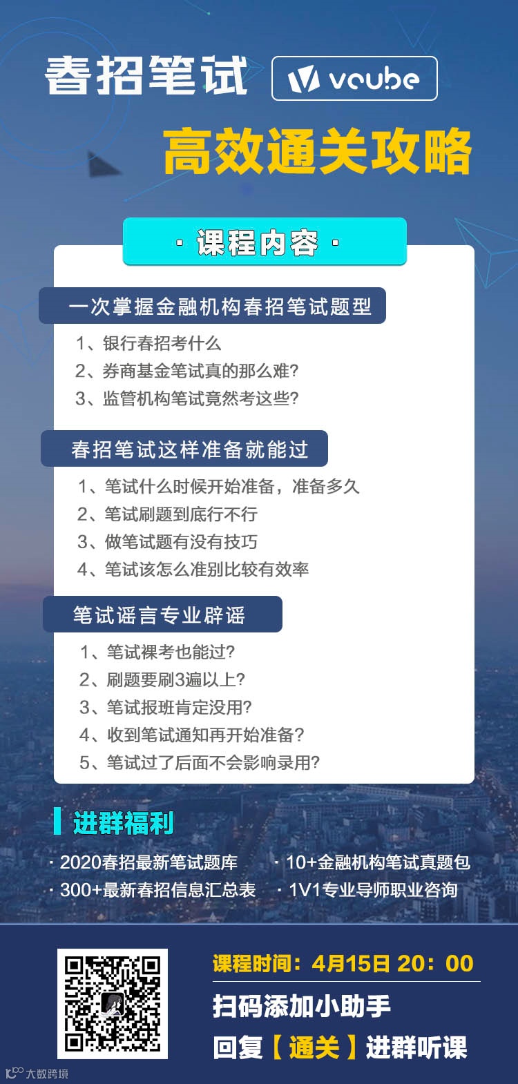 价值立方的金融行业求职规划专业导师团队,推出的《春招笔试-高效通关攻略》免费公开课,扫描海报二维码,回复口令『通关』,即可进春招通关群!
