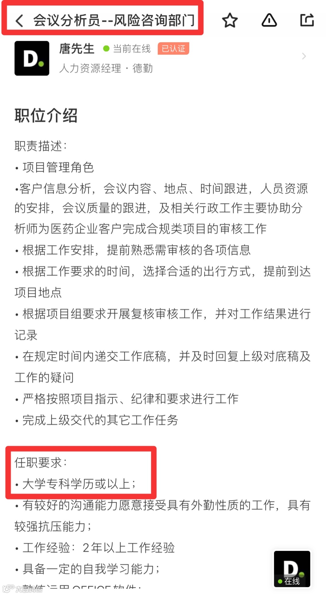 最近,还爆出部分二线所得岗位开始放开学历限制,比如,德勤重庆所的会议分析员,任职要求中,大学专科学历或以上即可。