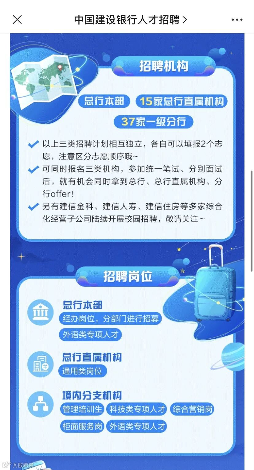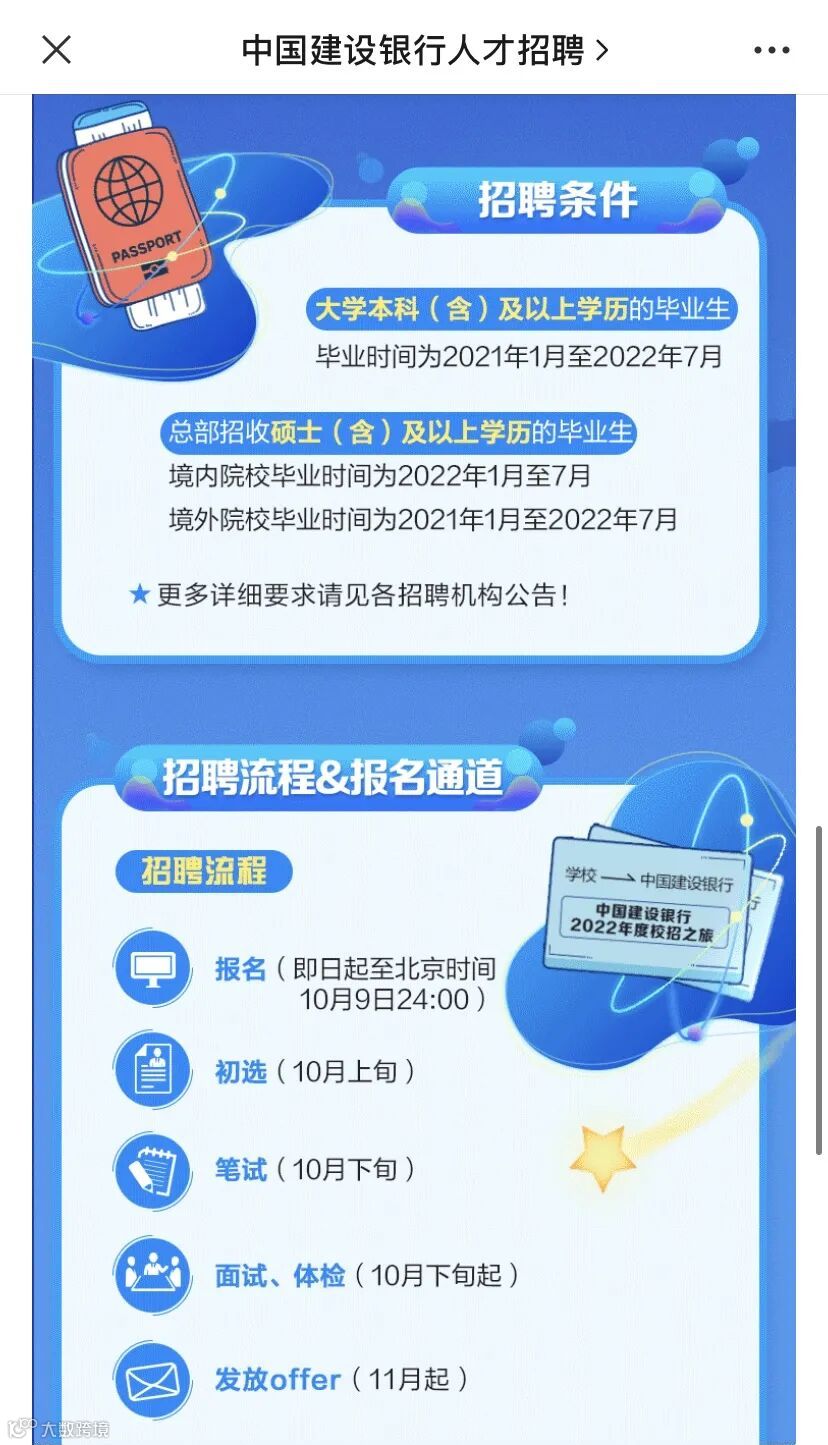移动端:关注“中国建设银行人才招聘”公众号,点击菜单栏“我要应聘”>“校园招聘”完成在线投递