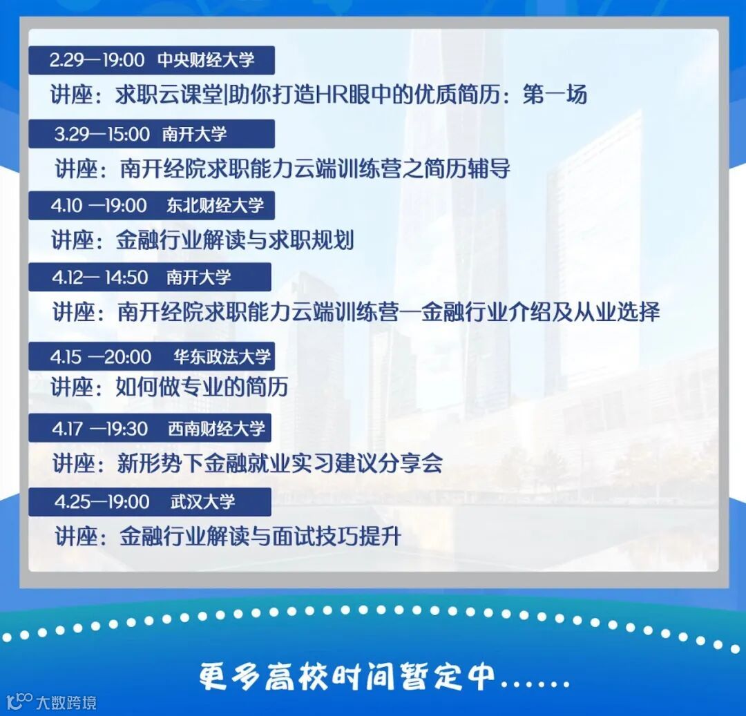 近期,各大高校与金融小伙伴陆续开展合作,完成多场线上分享,为学生提供求职的线上辅导和提升。