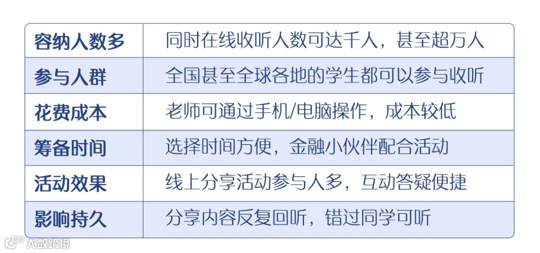 在线上分享活动中,高校负责在校生内部组织、宣传和维护,金融小伙伴提供分享嘉宾、内容和技术支持。