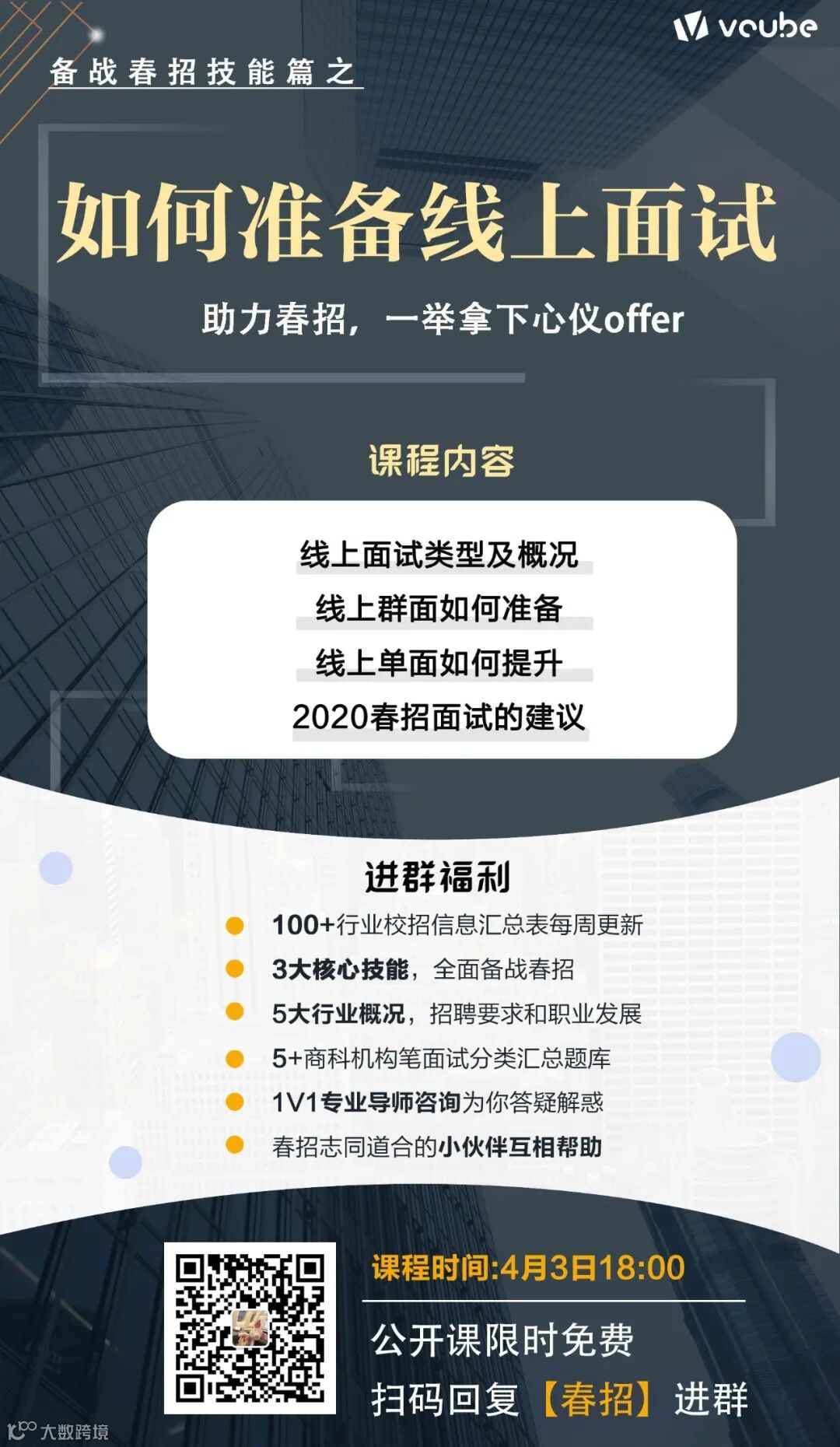 为了辅助大家远程也能更好求职,特邀请丰富面试经验的导师,免费给大家系统详解《如何准备线上面试?》,私信小助手『春招』,带你修炼面试通关技能!