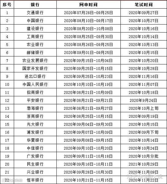 银行每年秋招集中在8—10月份,少数银行在7月就开始了,其中9月是招聘的黄金月,也有少数银行会将网申时间持续到11月份。