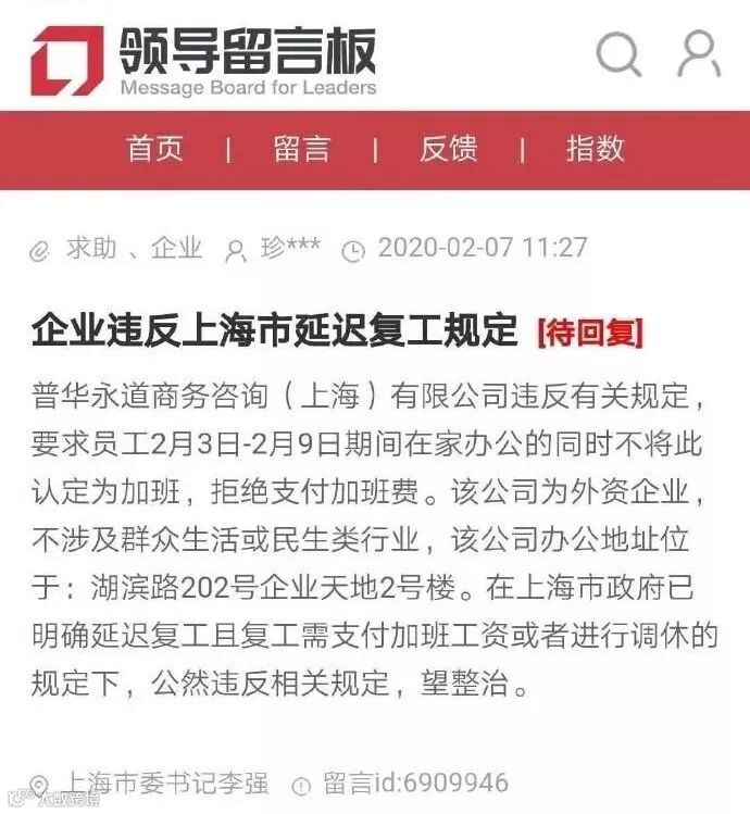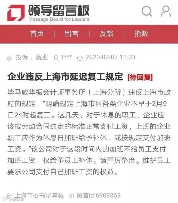 “该公司在上海政府明确延迟复工应支付加班工资或调休的规定下,公然违反规定,请严厉整治。”
