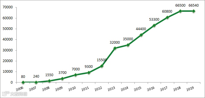 据相关数据显示,融资租赁业务从2006年发展至2019年底,全国融资租赁合同余额达66540亿元人民币,2014到2019年五年环比增长速度达107.94%,具体如下: