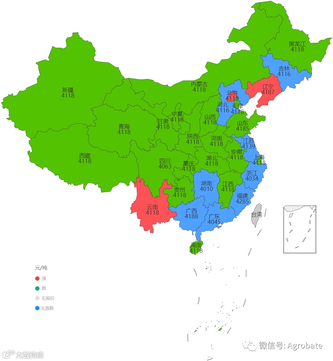导读:按行政省,采集不同样本点价格信息,计算玉米、豆粕大宗原料当日采购均价。 信息来自中国饲料行业信息网、Mysteel、百度爱采购等。统计时间不同会造成当日价格有小幅差异,供参考。