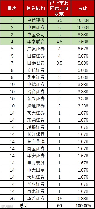 这60家企业分属26家券商,其中中信建投以6.5家企业斩获第一,只比第二名中信证券多了0.5家。中金公司和华泰联合分别以5家、4.5家紧追不舍。