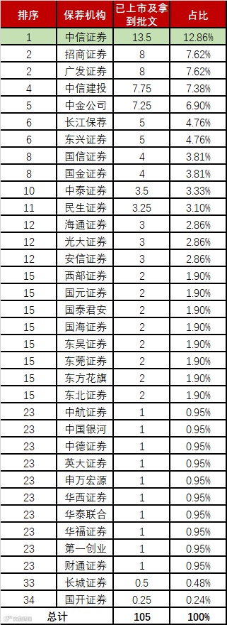 而在普通板上,中信证券是当之无愧的“一哥”。根据价值线研究院统计的数据:今年前10月,普通板共有105只新股上市,中信证券当之无愧地排行第一,上市项目多达13.5家。招商证券、广发证券均有8家企业上市并列第二。