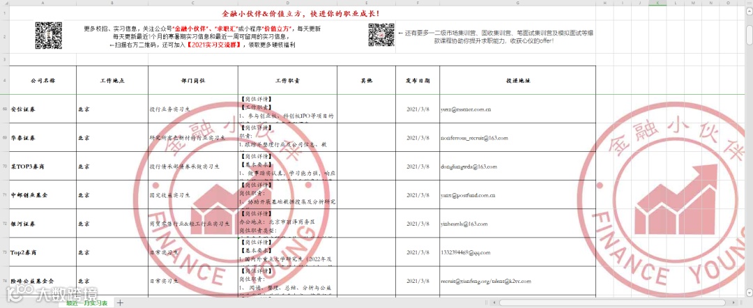 金融小伙伴致力于搭建一个金融垂直领域职业信息分享和交流公益平台,通过持续不断的公众号推文和线上线下活动,提供及时、全面、高效的行业招聘信息和职场提升经验。目前,我们已吸引了超过100万粉丝,在海内外金融学子和在职人士中均享有盛誉。