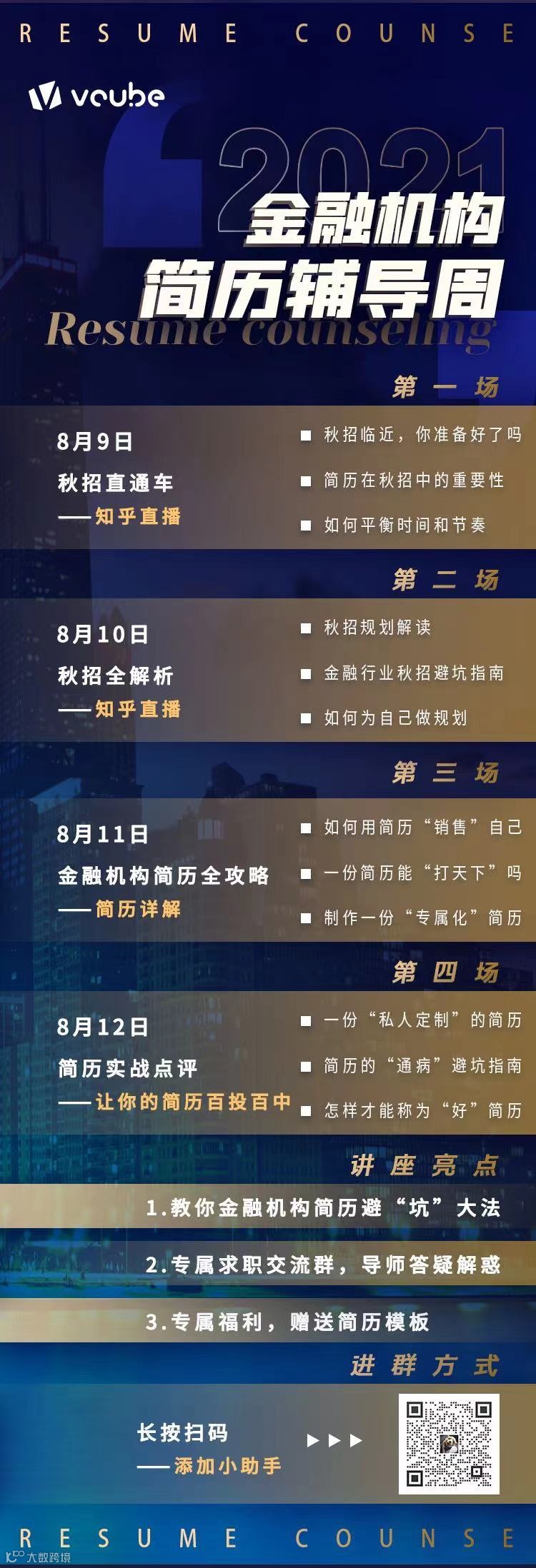 为了让大家更好的准备秋招,更高胜率的斩获秋招offer,金融小伙伴特别在为大家准备了四场全方位解析秋招的讲座,还有免费福利可以领!
