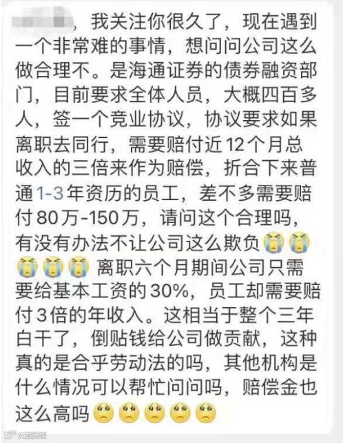 某证券债券融资部门超过400名全体员工签署竞业协议,要求如果有员工离职后入职同行业公司,则需要向公司赔付近12个月总收入的三倍金额作为补偿。