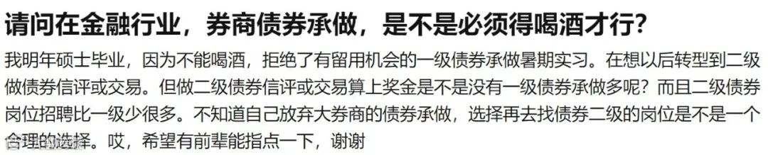 知乎上有很多同学问过类似券商喝酒的问题,甚至有些人因为喝酒拒绝了工作,或者是被拒绝,这样的例子屡见不鲜。