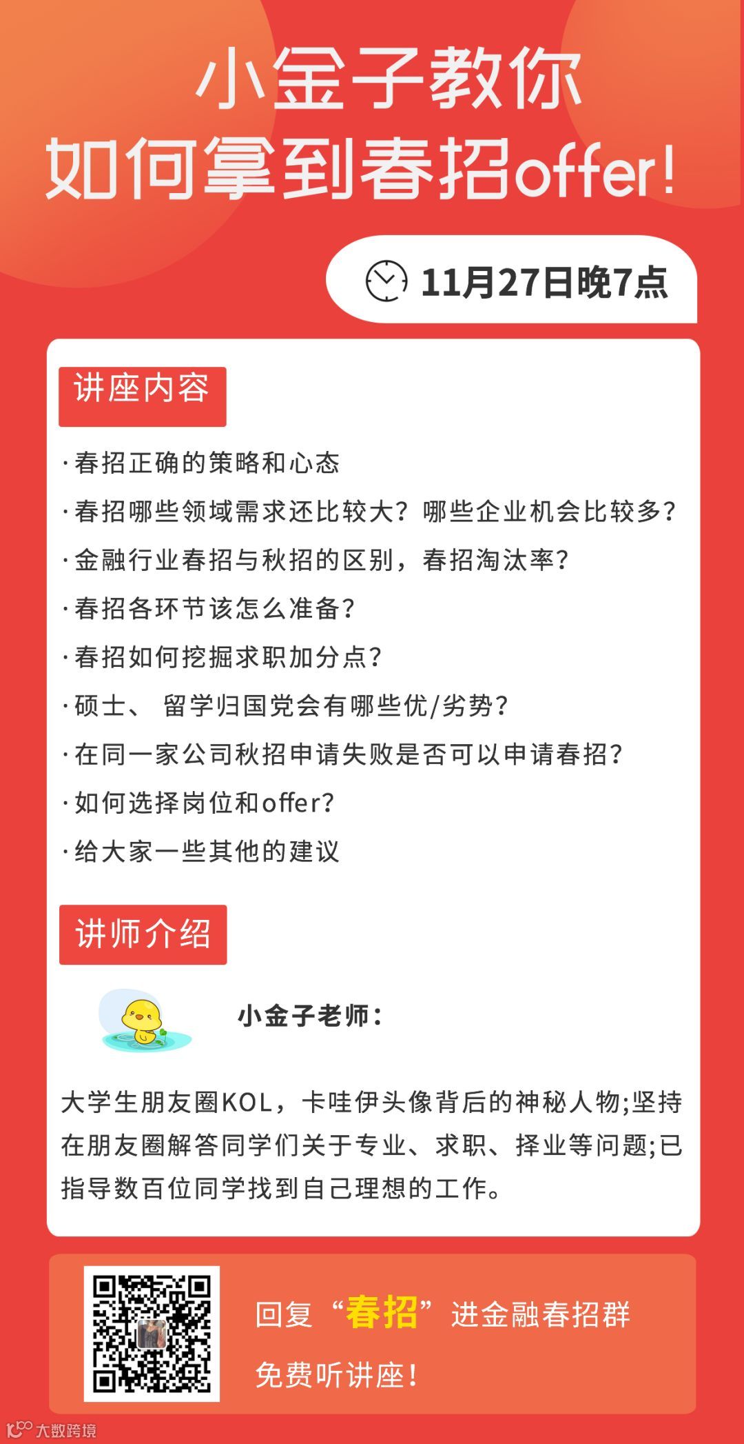 也会聊聊春招各环节该怎么准备?如何选择岗位和offer?如一二级都有哪些就业机会等等, 下周三晚7点(11月27日19:00),在本群如约开展讲座《小金子教你如何拿到春招offer!》,确认过,是由大家崇拜的小金子老师主讲哦~