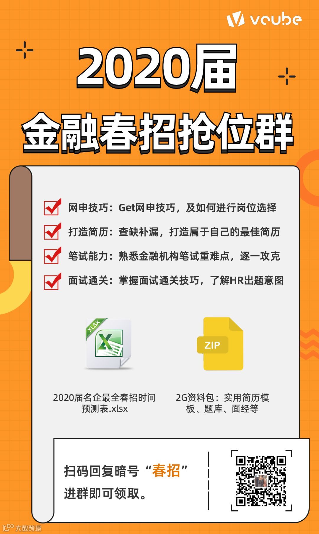 为了同学们不再错过春招,金融小伙伴为大家整理了《2020届名企春招时间预测表》,帮助同学们掌握春招第一动态,只有早知道+早准备才能斩获offer哦~