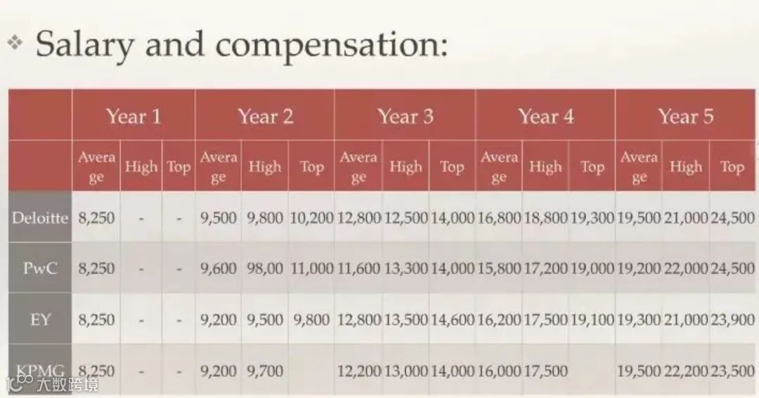下面是网上流传的一份四大薪资表单,从Year1到Year5,每一年每一所的薪资都列了出来,应届生第一年的平均起薪都在8000左右。
