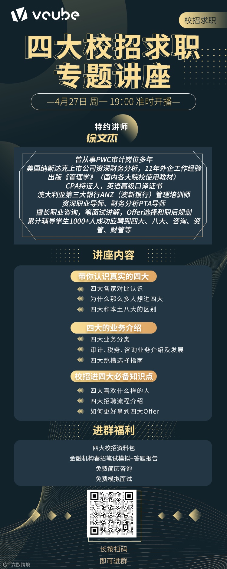 C师兄,国外QS100金融类专业硕士,目前就职于普华永道审计岗。此前曾在国内某八大工作,曾从事财务咨询,金融审计相关工作。