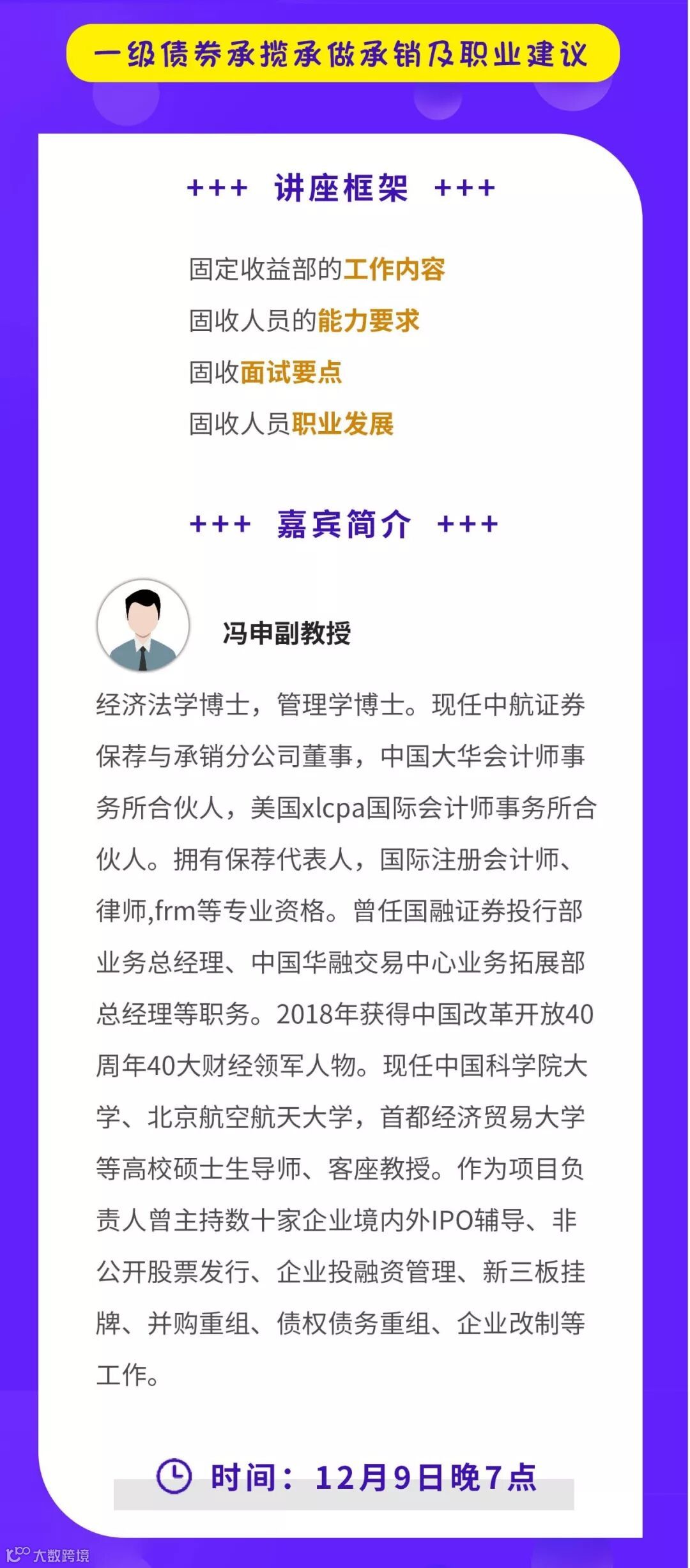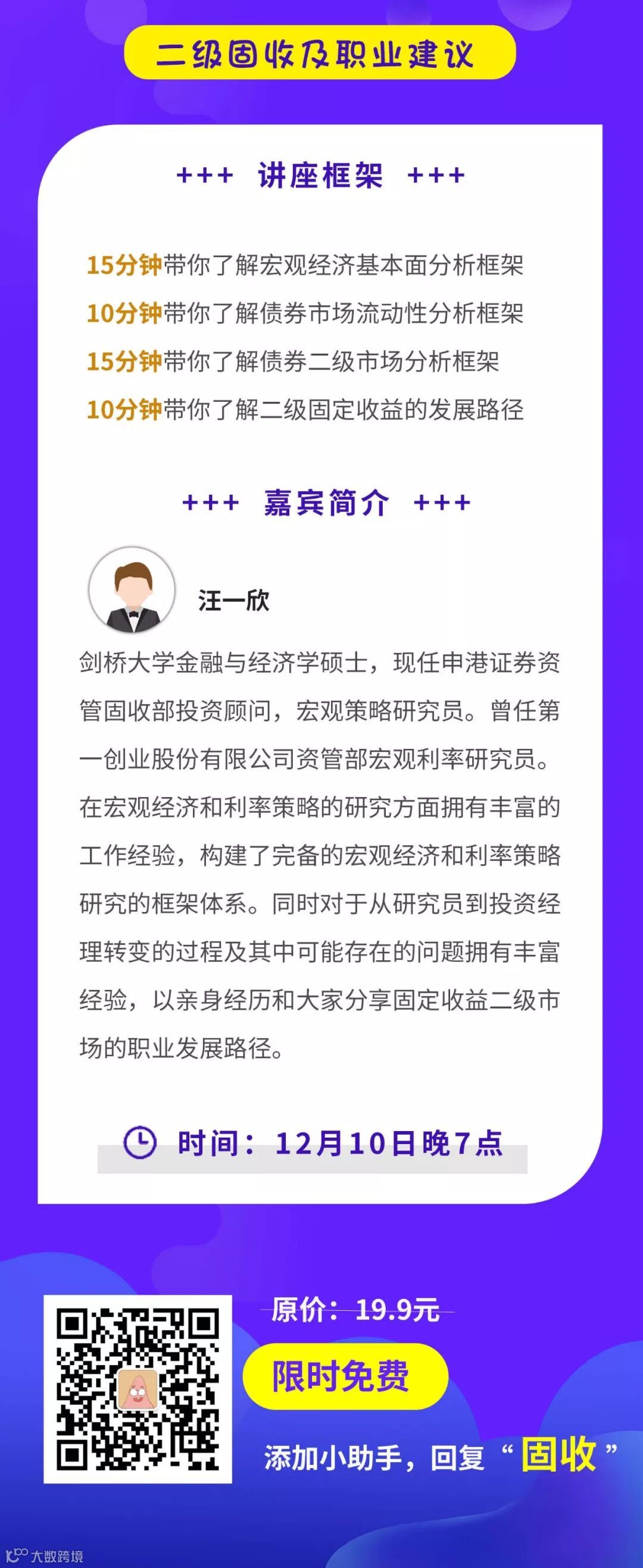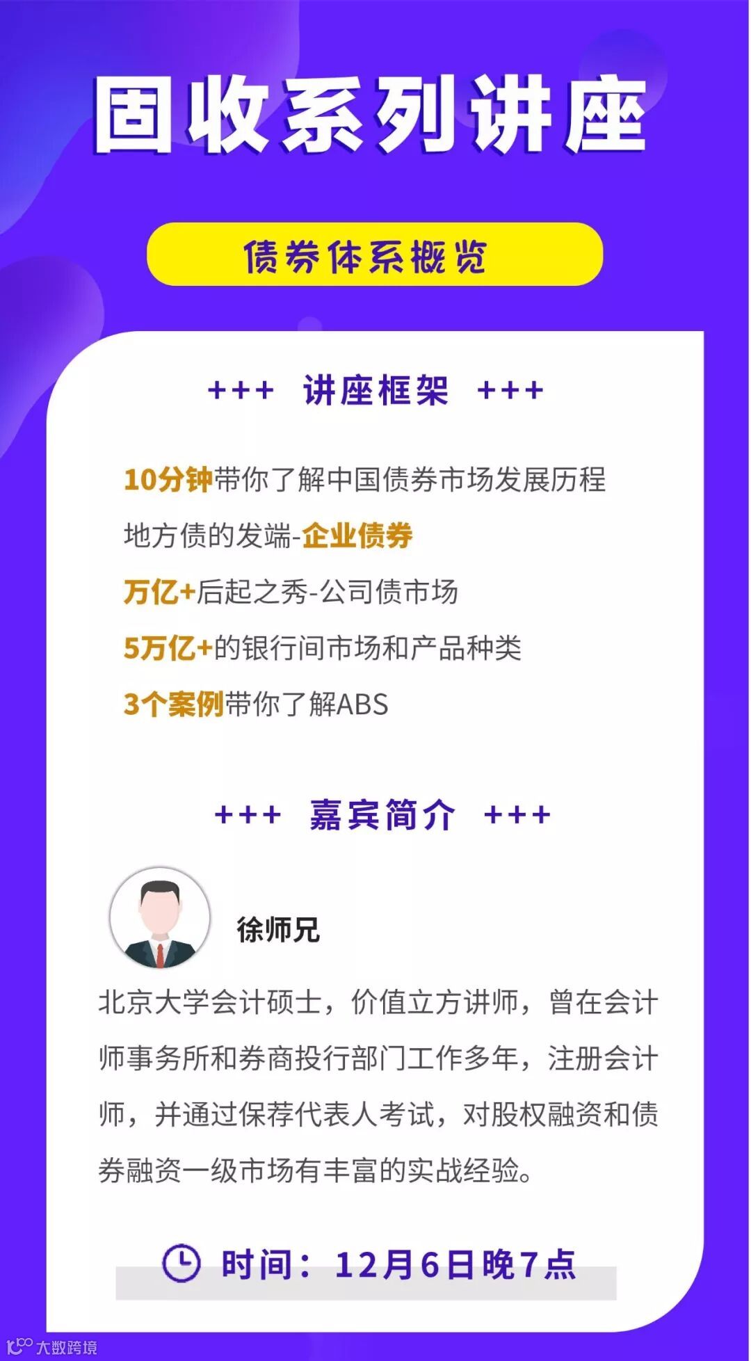 12月6日、12月9日和12月10日三位大佬为大家提供固收系列讲座,分别为你介绍债券的体系如何,一级固收的工作及职业建议和二级固收的工作内容及职业机会在哪里。