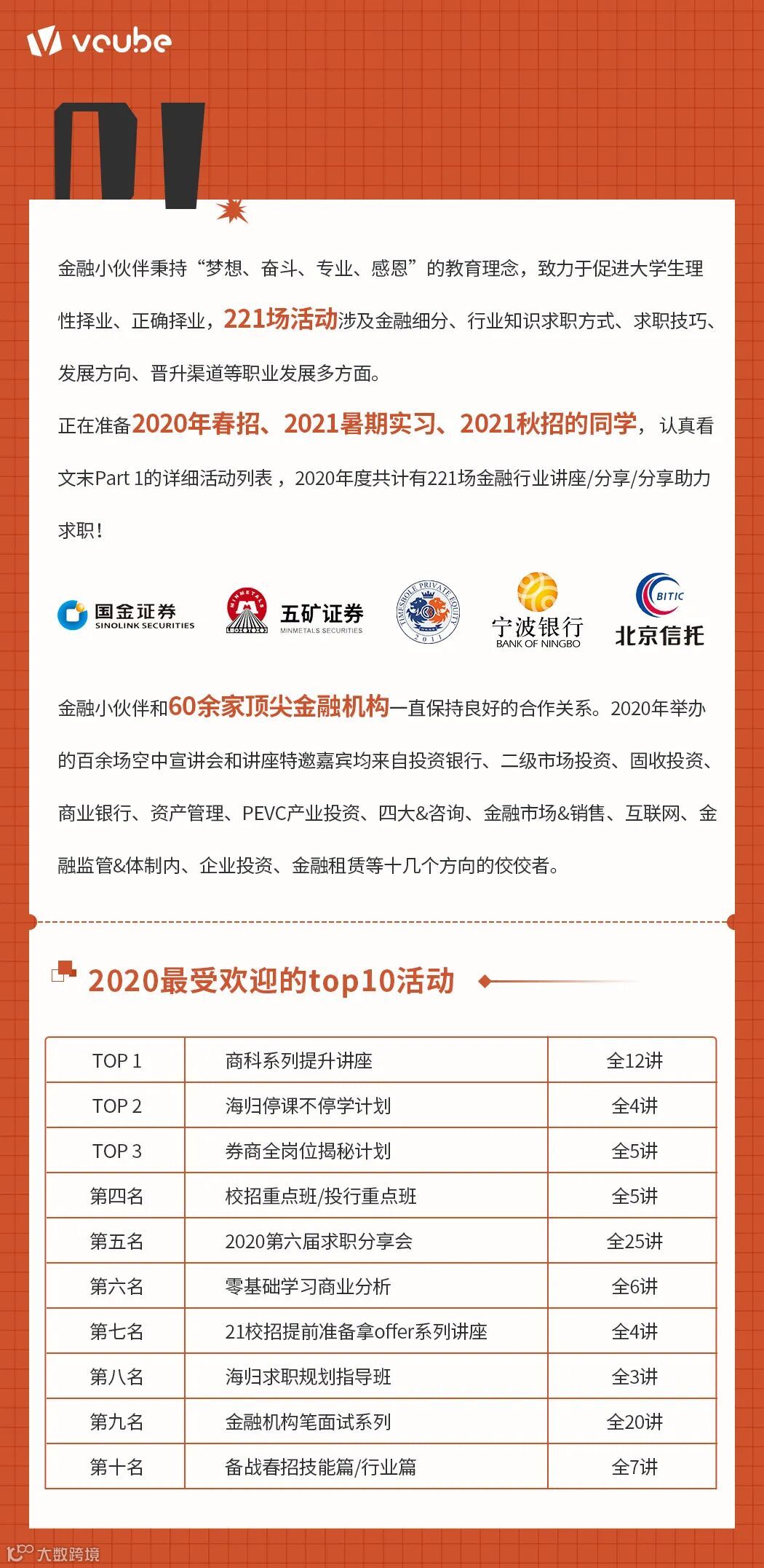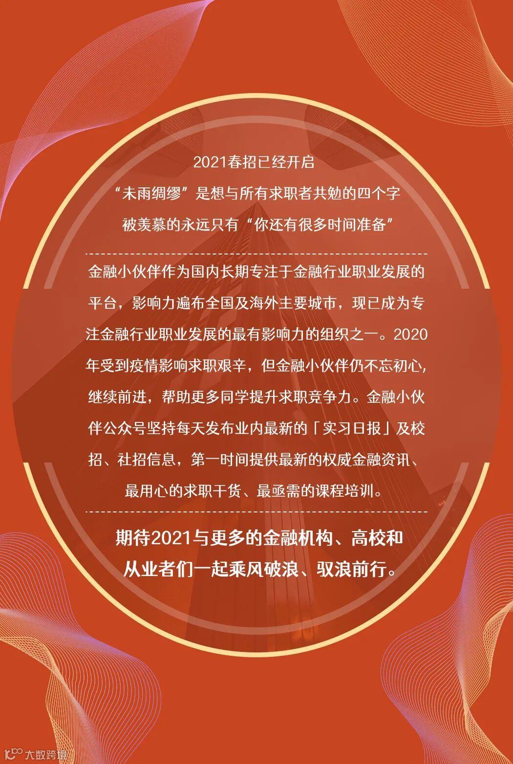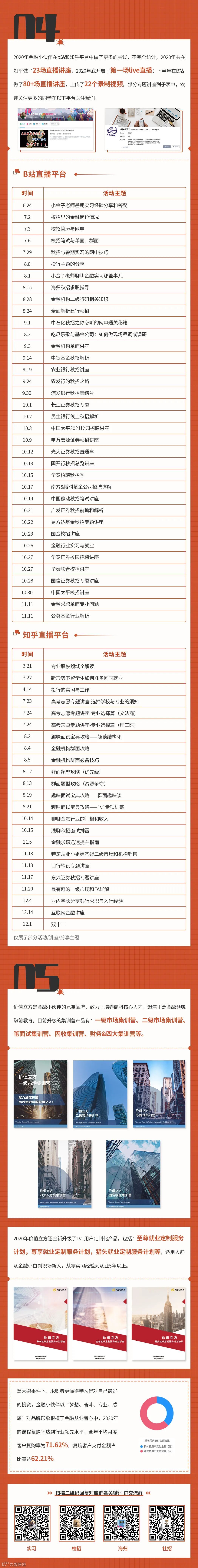 金融小伙伴致力于搭建一个金融垂直领域职业信息分享和公益平台,2020年的成绩离不开所有人的努力。感谢各大金融机构、全球各大高校对金融小伙伴始终如一的支持与帮助,感谢金融小伙伴的金融行业内导师团队的深耕细作,感谢海内外学子对金融小伙伴一如既往的认可。