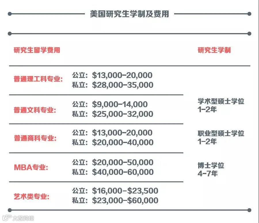 不同的学校,收费不同,公立综合大学:每年约为 $15,000 ~ $30,000;私立综合大学:每年约为 $25,000 ~ $45,000;文理学院:每年约为 $30,000---$40,000社区学院:每年约为 $6,000---$10,000。