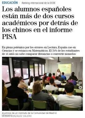 也就是说,如果一个15岁的西班牙学生到北京或上海读书,其水平相当于当地12或13岁的学生。相反,一个15岁的中国学生的水平则相当于西班牙大学生水平。