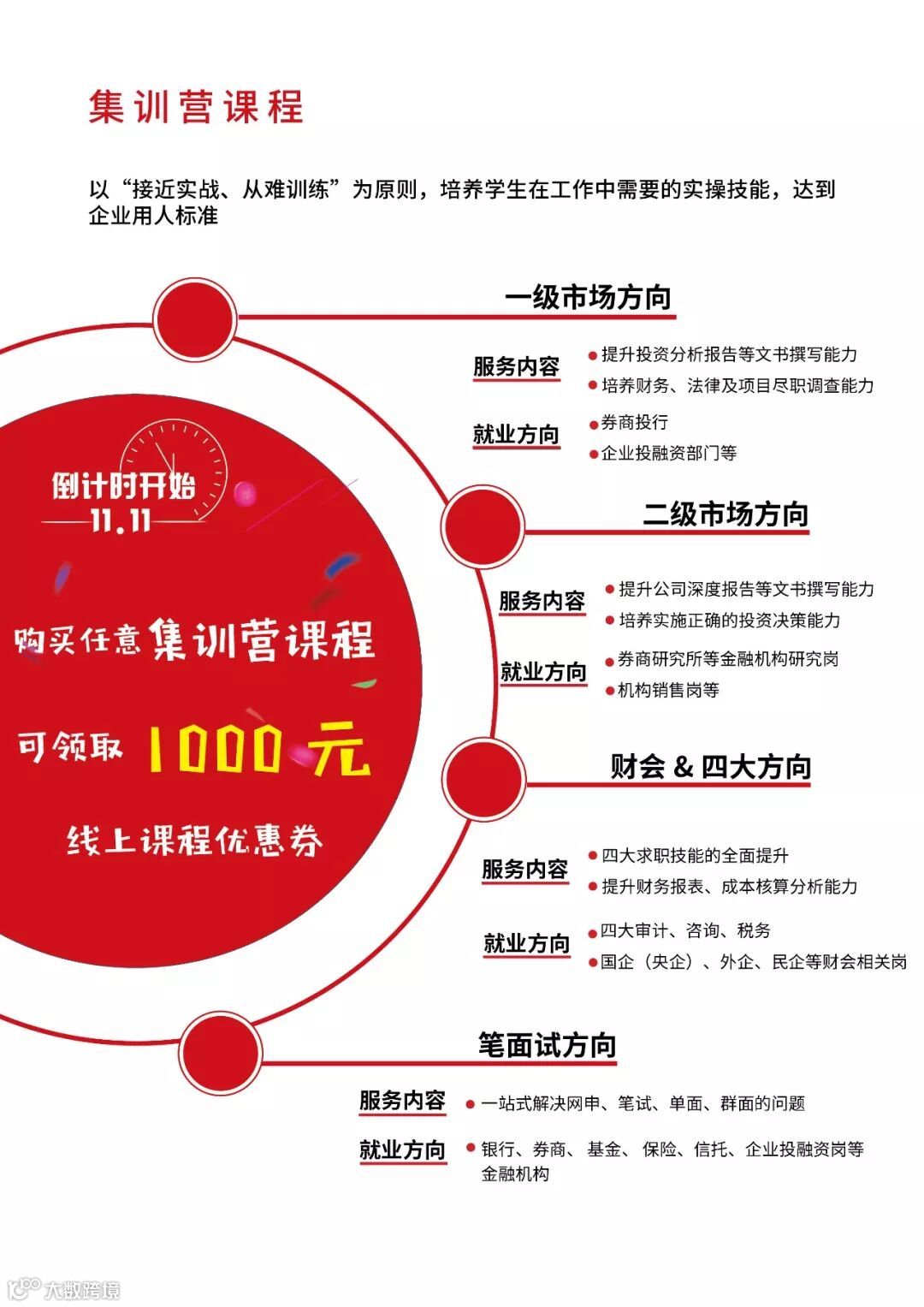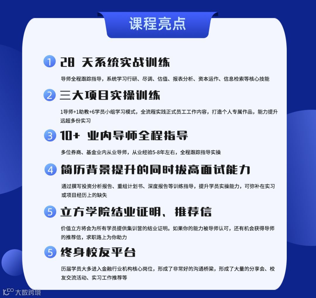 想从事金融的每位同学,都应该上一次集训营课程,这里能提升一级市场、二级市场需要的实操能力,这里能让你变身为笔面试“考霸”,这里能带你走近四大,这里能让你与梦寐以求的金融行业更近一步。