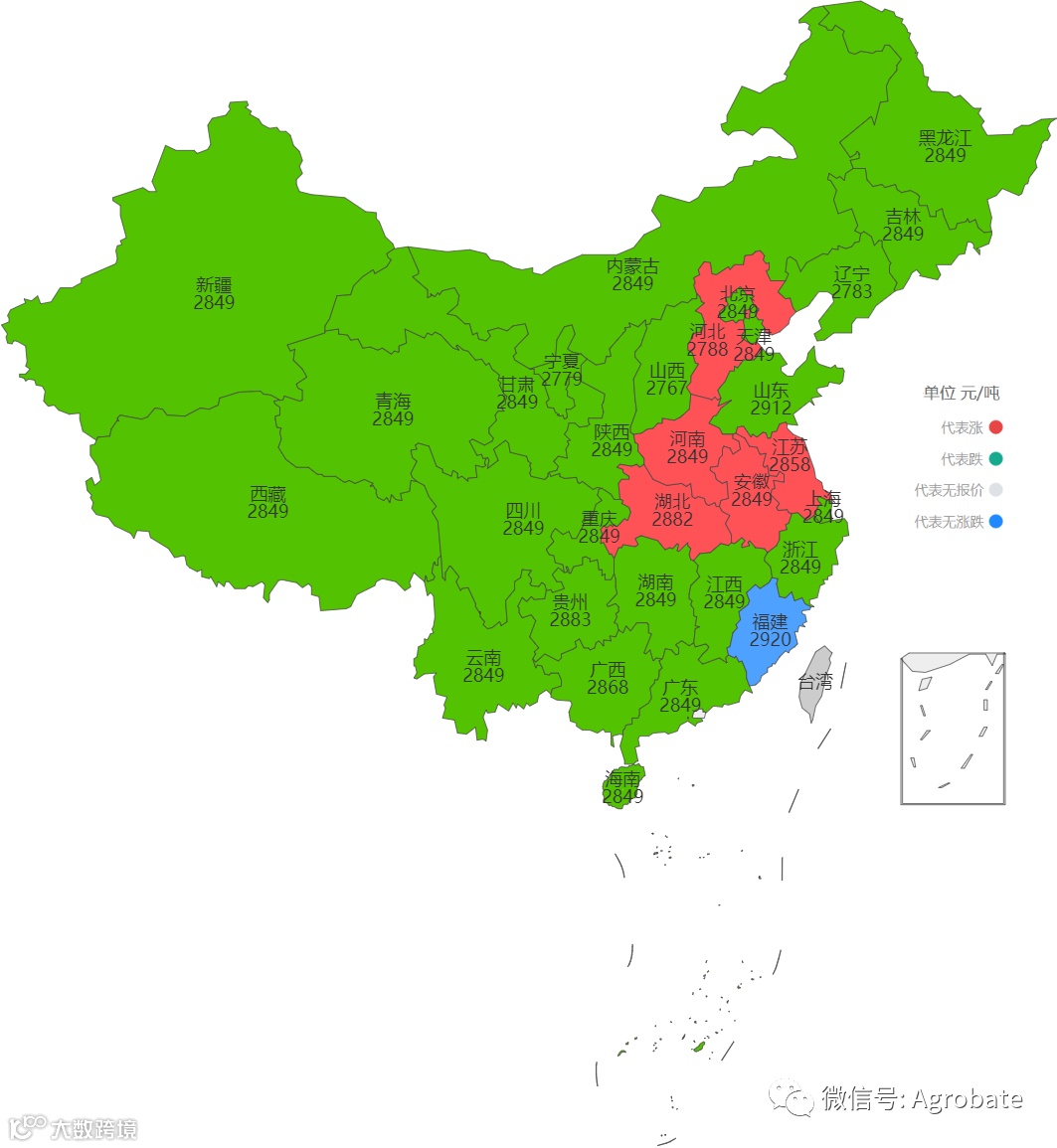 导读:按行政省采集不同样本点价格信息,计算玉米、豆粕大宗原料当日采购均价。 信息来自中国饲料行业信息网、Mysteel、百度爱采购等。供参考。