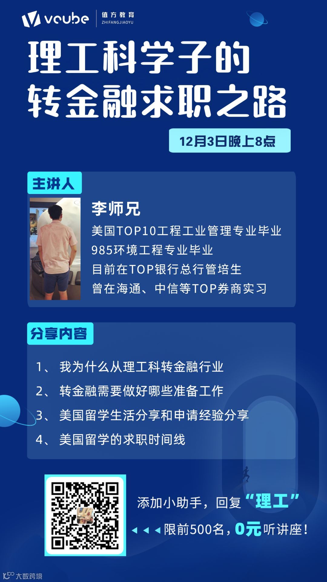 除了补齐相关的基础知识之外,我们还需要做好哪些准备工作呢?带着疑问来找李师兄,下周二(12月3日)20:00,将为大家分享【理工科学子的转金融求职之路】,看看他是怎么做,让你更清楚远方的路该怎么走!