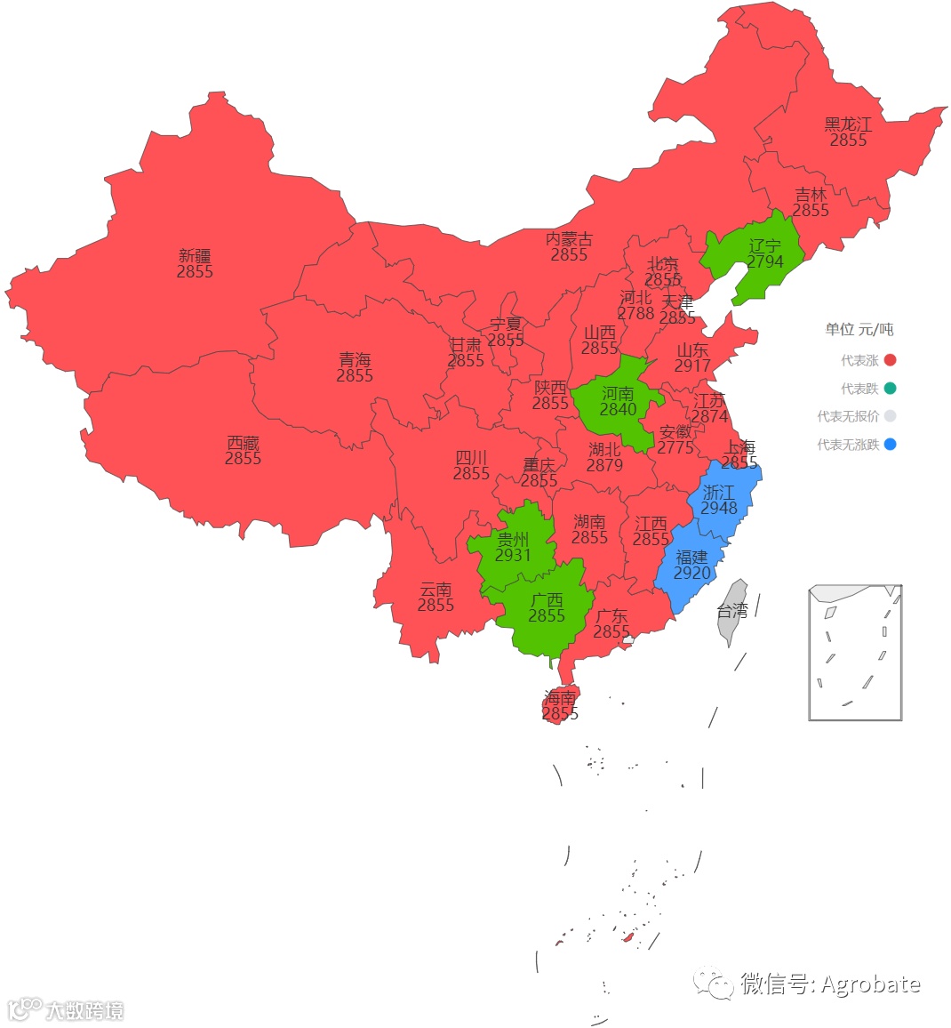 导读:以行政省为区划,玉米豆粕大宗原料每日采购均价。信息来自:中国饲料行业信息网、我的钢铁(mysteel)、百度爱采购等。统计时间不同会造成当日价格有小幅差异。