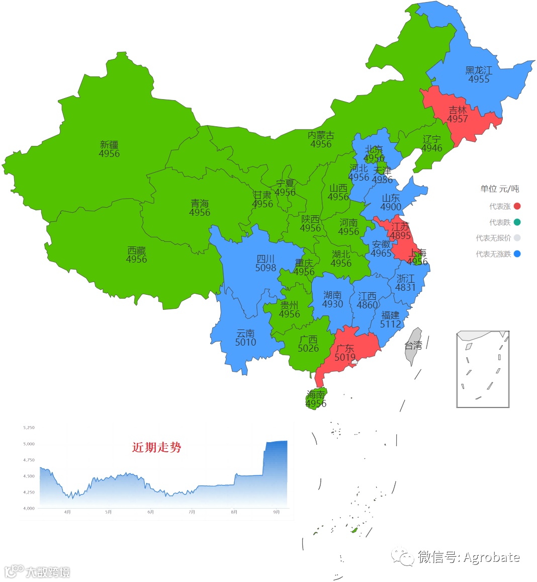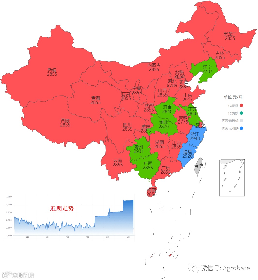 以行政省为区划,采集样本点价格信息(来自中国饲料行业信息网、我的钢铁(mysteel)、百度爱采购等),计算玉米、豆粕大宗原料每日采购均价。今日采集截止时间11:30,统计时间不同会造成当日价格有小幅差异。