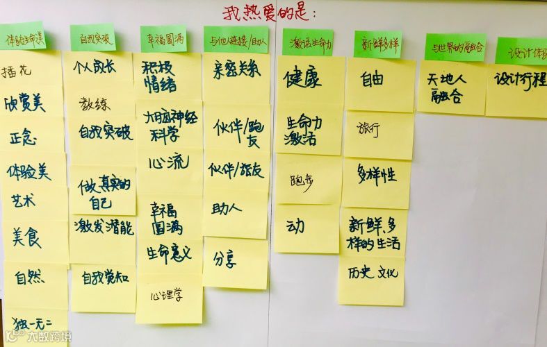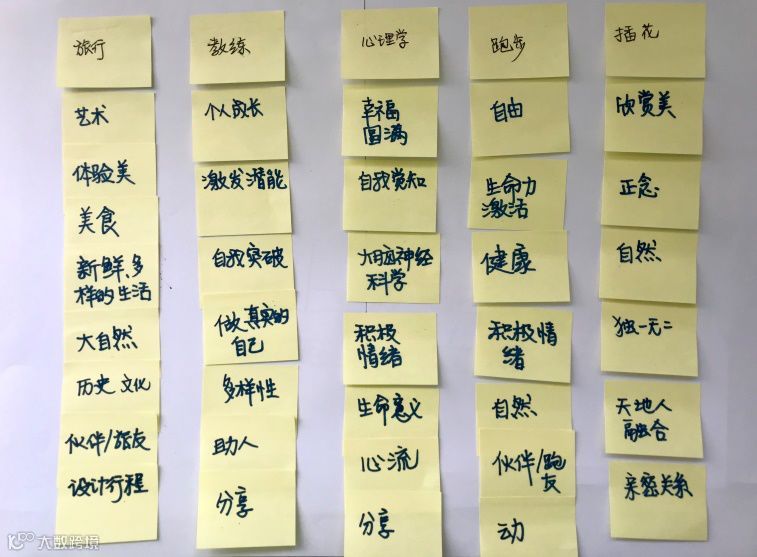 第一步:用便签贴写出一些你喜欢做的事,至少列5件事。比如:旅行,跑步。
