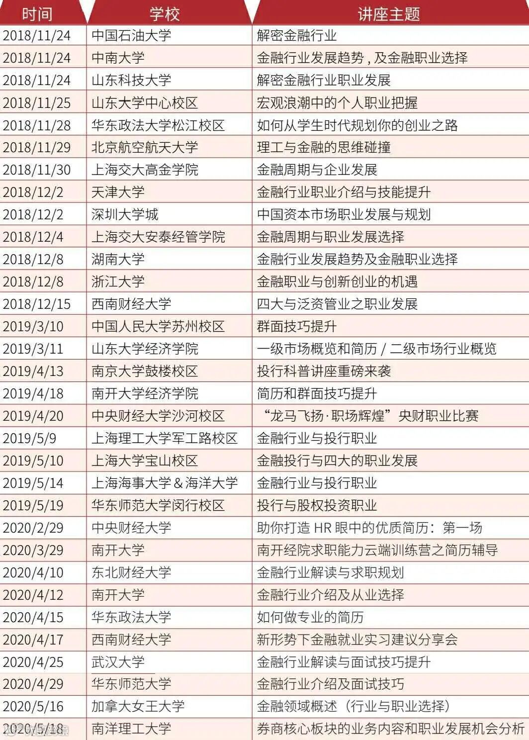六年公益,百校巡讲,六年来坚持支持各地学校职业发展,每年都会集中数次走进全国各大高校 ,与各校就业中心深度合作,根据学校特色及需求,定制相应的职业分享内容,包括行业大咖讲座、师兄师姐返校分享、校招情况解析、求职技能提升、求职比赛协办等,金融小伙伴是你求职路上的永远陪伴。