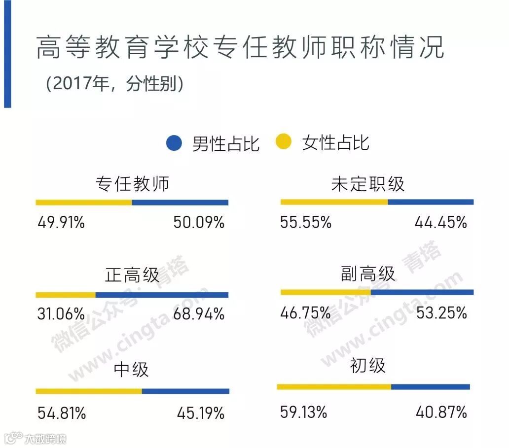 尽管博士生中女性的占比还尚未达到40%,但高校专任教师中女性的占比却在近两年,已经基本达到一半。