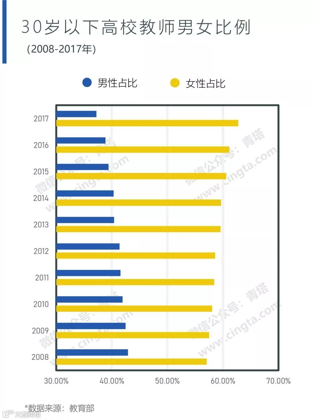 从全国普通高校的总体情况来看,30岁以下的专任教师中女性占比早在10年前的2008年就已达到57.10%,远远超过50%。2017年,30岁以下的女性高校专任教师已经增长至12.2万人,占比接近63%。