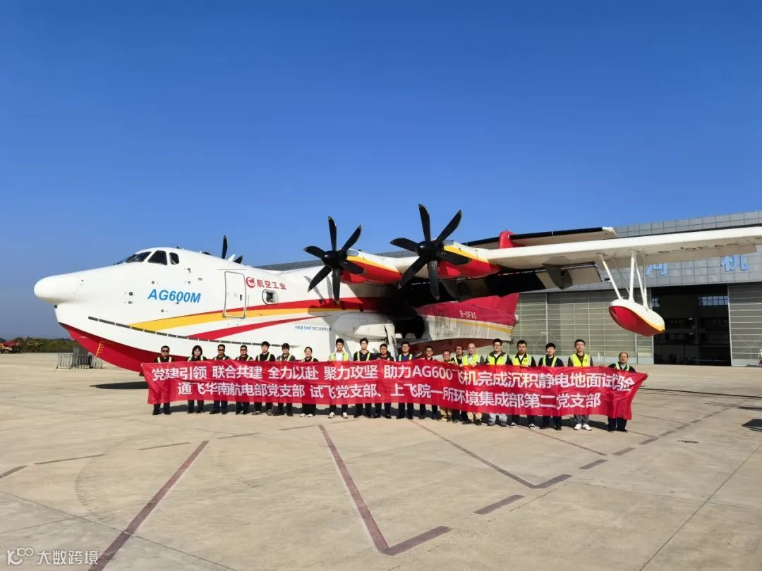 近日,由中国航空工业集团自主研制的大型灭火/水上救援水陆两栖飞机AG600全机沉积静电地面验证试验(MOC5)在湖北荆门顺利完成。中国航空工业集团通飞华南航电部党支部、试飞党支部与试验方中国商飞上飞院一所环境集成部第二党支部在荆门漳河机场试验场地联合成立了“AG600沉积静电地面验证试验突击队”,充分发挥党建引领作用,助力试验顺利完成。