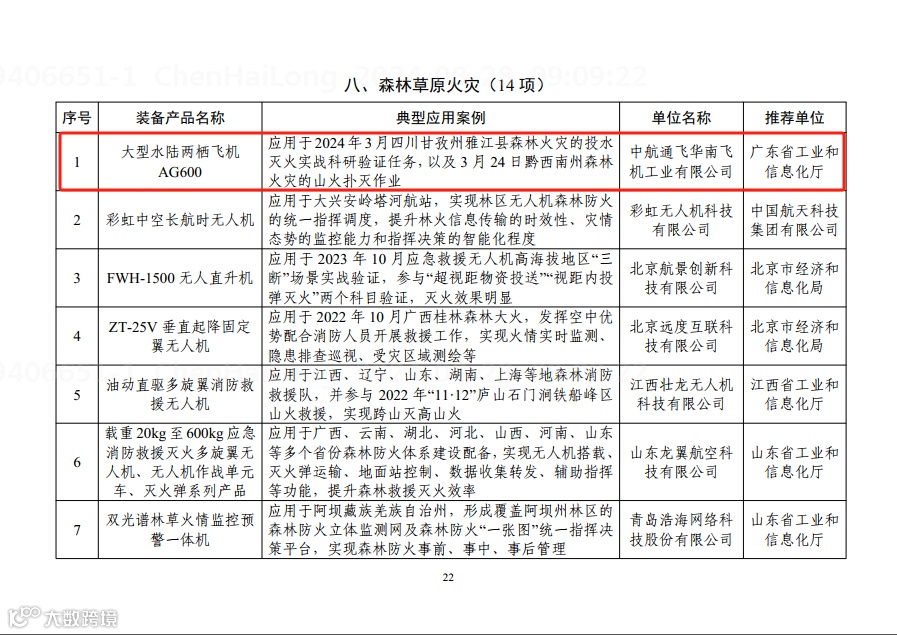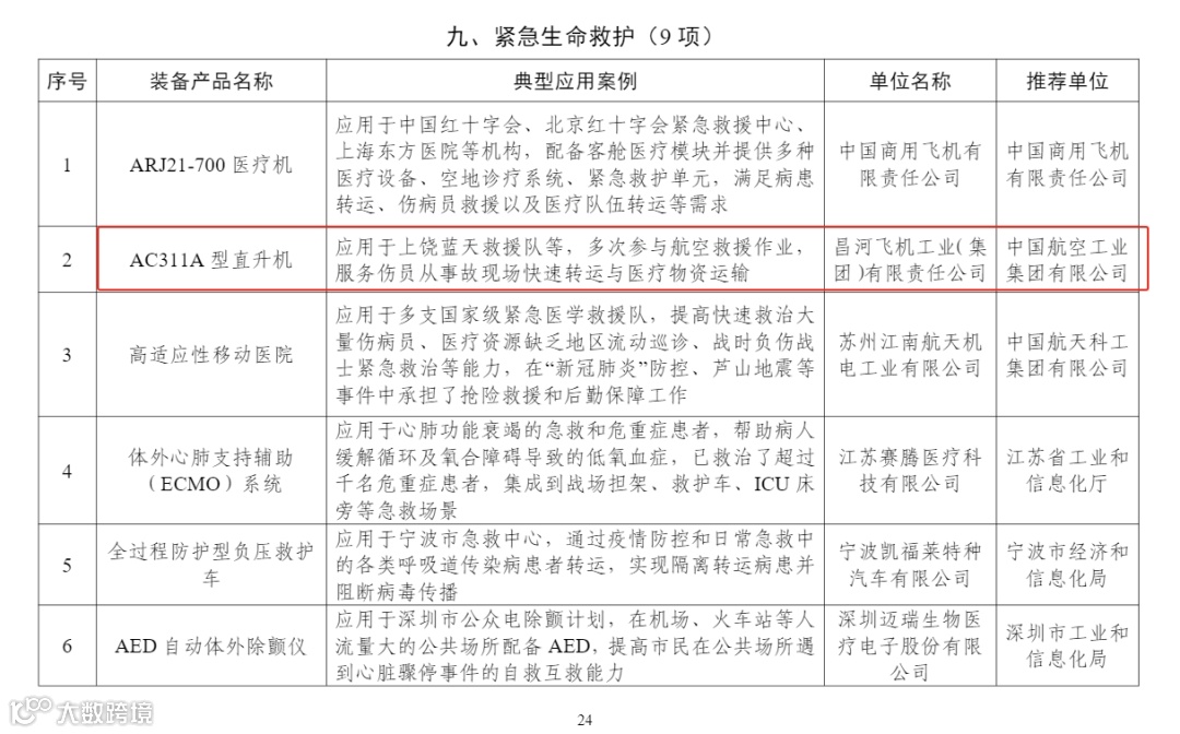 近日,工业和信息化部办公厅发布了《关于公布2024年安全应急装备应用推广典型案例名单的通知》,“AC311A直升机搭建空中救援生命线”“‘鲲龙’AG600执行森林火灾山火扑灭作业”成功入选“紧急生命救护”和“森林草原火灾”典型应用案例。