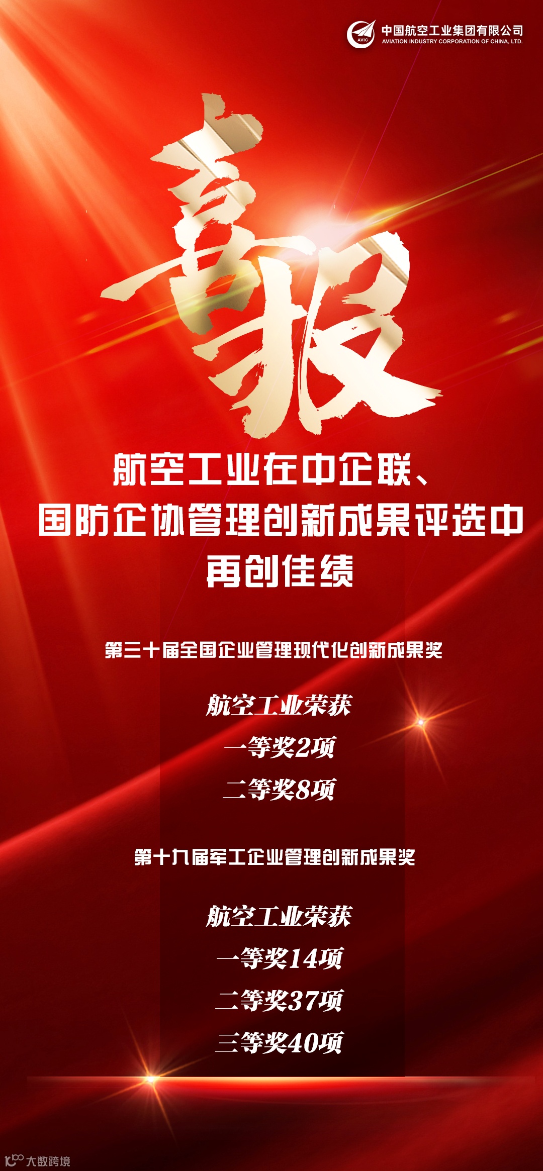 近日,中国企业联合会发布了第三十届全国企业管理现代化创新成果奖,航空工业荣获一等奖2项,二等奖8项。其中,航空工业沈飞/沈阳所申报的《基于自主创新的歼15舰载战斗机多维协同研制管理》获一等奖,名列前茅;航空工业总部申报的《军工集团实现高质量均衡生产的复杂产品群生产管理体系建设》获一等奖,是军工集团总部唯一的一等奖成果。航空工业成飞、通飞华南、中航西飞、中航光电、中航重机、导弹院、长飞、中航电测8项成果获二等奖。同期,中国国防工业企业协会发布了第十九届军工企业管理创新成果奖,航空工业荣获一等奖14项、二等奖37项、三等奖40项。