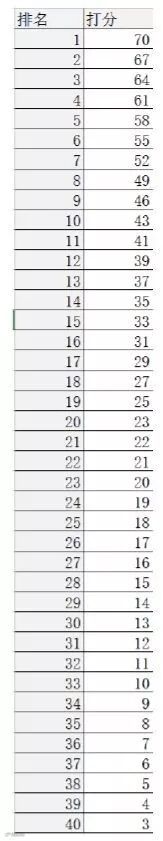 ④将基准高校每个省份的排名得分进行汇总加总,求取平均分,得到最终结果。27个基准省份,每个省份都会得到一个录取分数线从高到低1-40名高校的打分表(大概如下图所示),而将这个打分表,每个高校的得分,加总求取平均数,就得到了平均分。这个平均分,就代表了这个高校,在全国不同省份的认可程度的加权平均水平,是可以线性对比的。我们根据这个平均分对基准池高校进行排名。需要说明的是,没有招生,或者招生分数不可知的高校,得分为”-”,不参与排名,如中国科学院大学,协和医学院在很多省份不招生的,但他们招生的省份,分数线可能并不低,所以仅以其有录取分数的省份进行平均。
