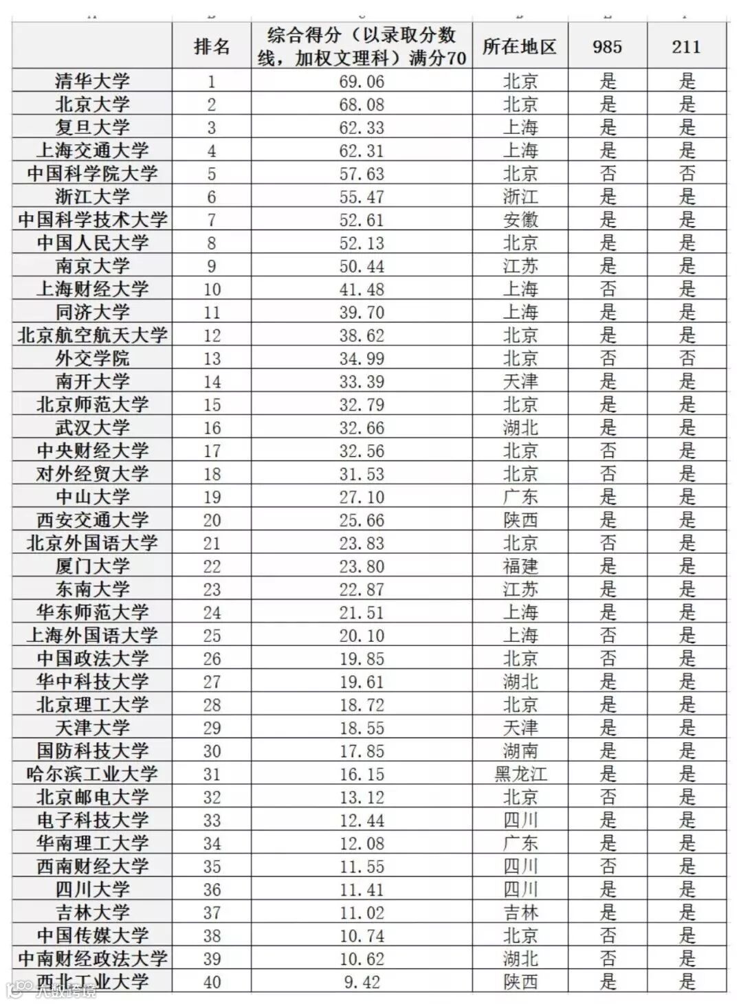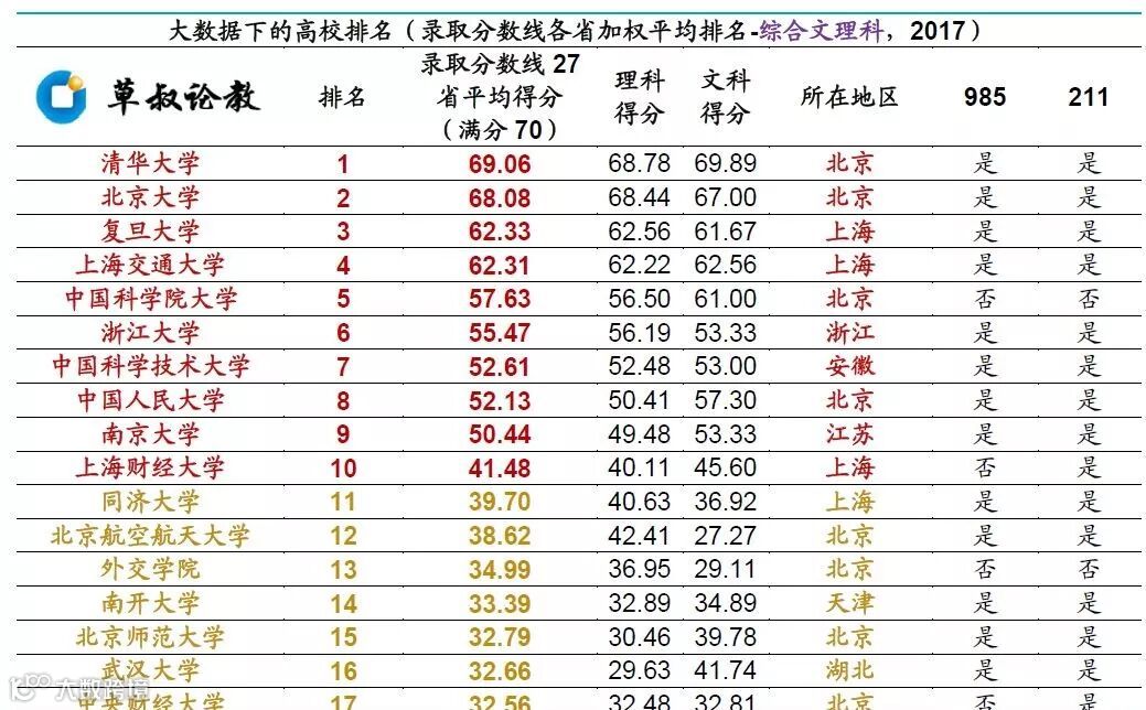 录取分数线只考虑了最低分数,代表“这个学校的门槛”,但是没有考虑学校的上限和方差,有些学校虽然录取分数线不算高,但是有很强势的专业,上限可能很高,这个就不是录取分数线可以考虑到的范畴了。此外,作为考虑基准的70个学校,可能会因为笔者的疏忽漏包含一些实力很强的学校,笔者在此提前致歉。总体来说,录取分数线,还是非常具有代表性,且足够透明,足够量化的排名指标。