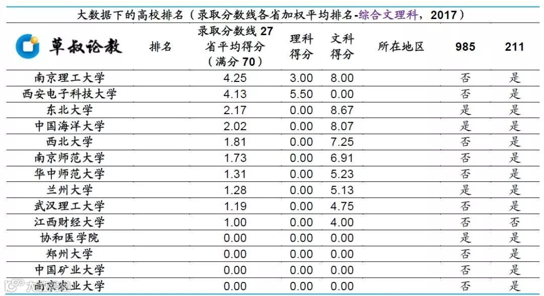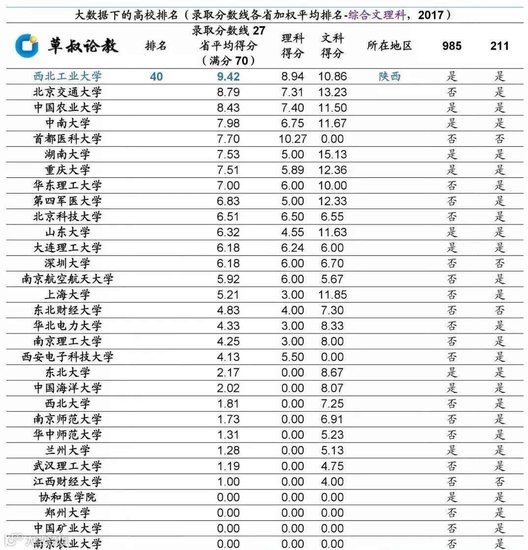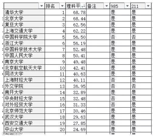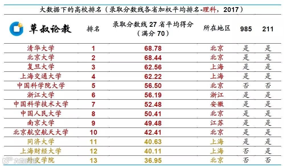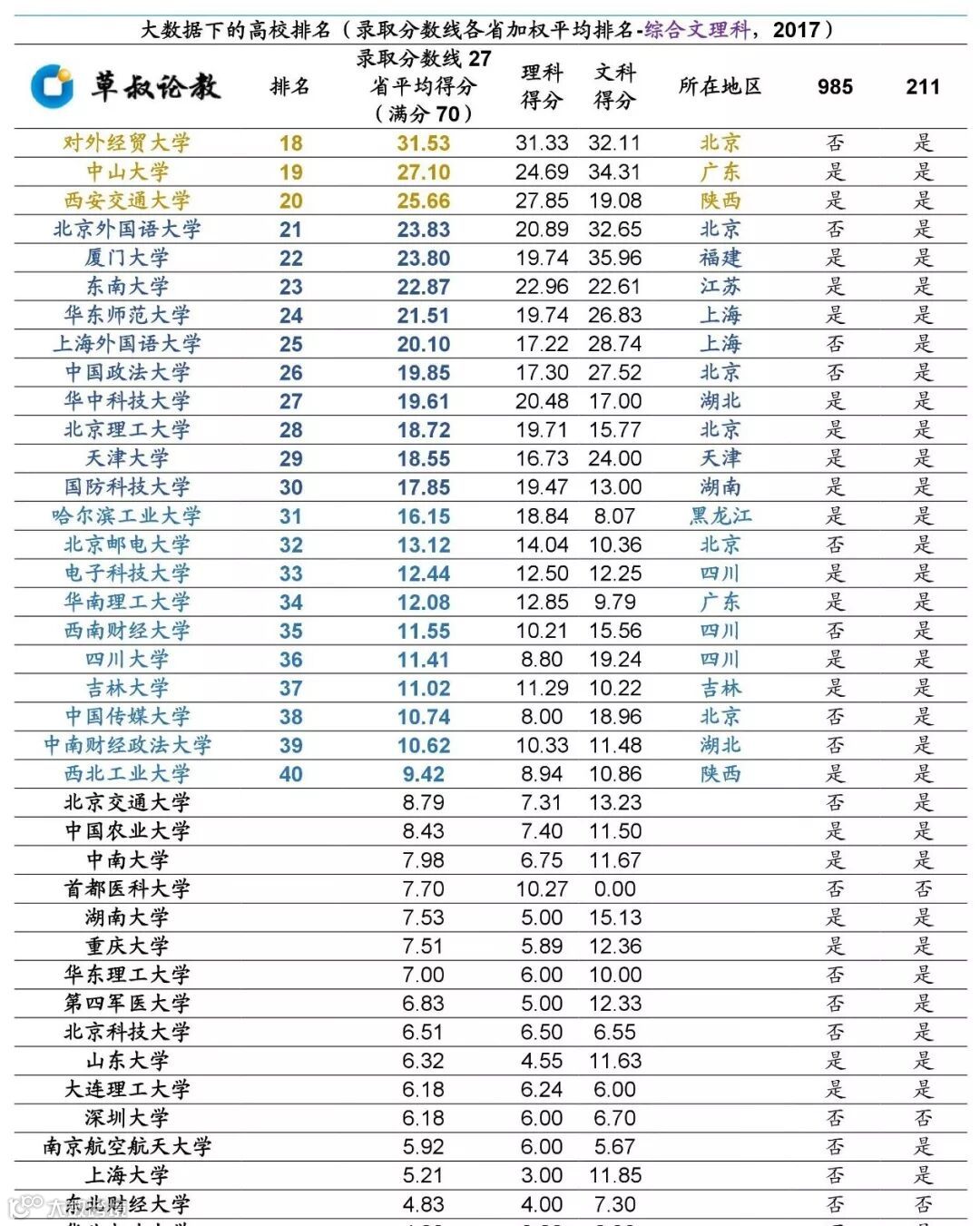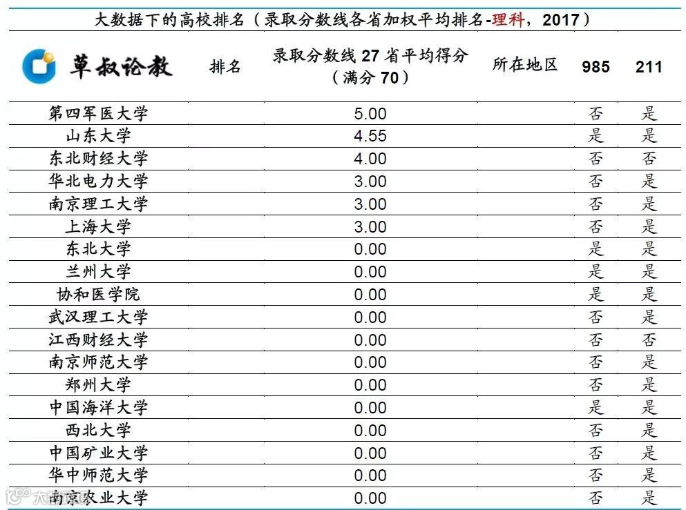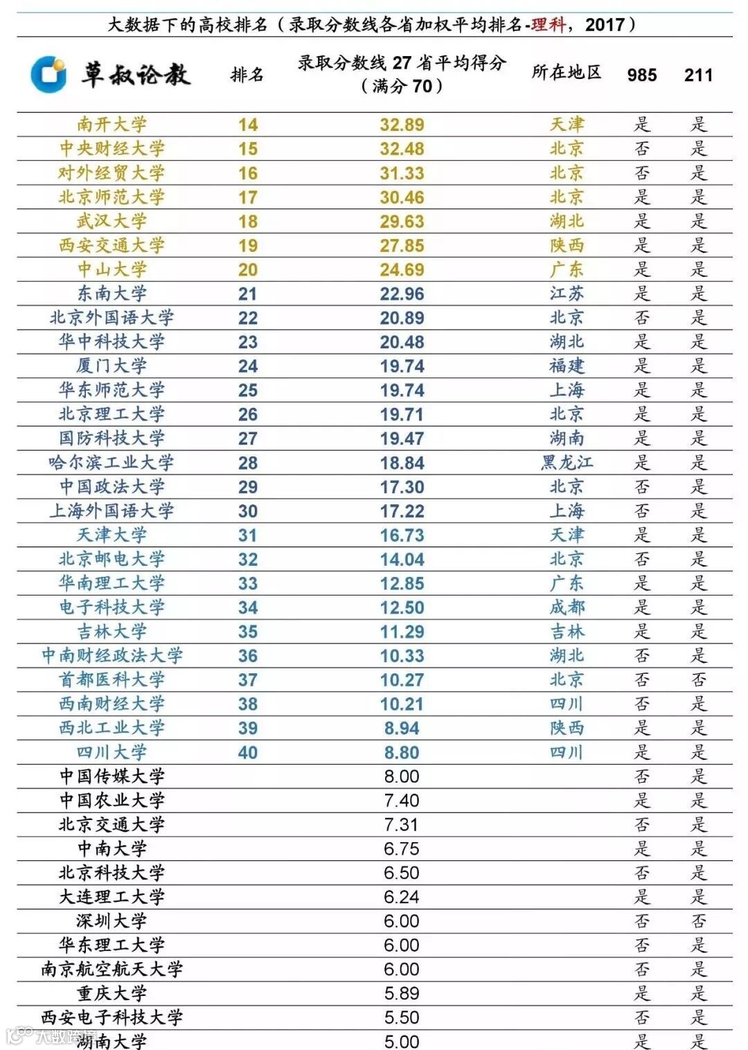 最终加总加权平均得到的结果,是下图这个平均分(不过下图这个仅仅为理科,后面还需要综合文科的情况,且下图仅为部分截取),我们将在下面的环节详细论述完整版结论。