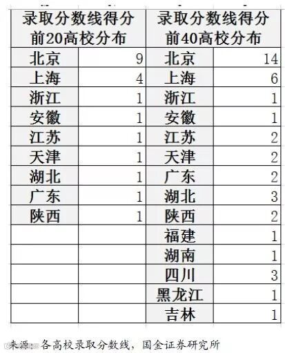 排名前40的学校中,北京占13所(除上述外还有中国政法,北理工,北邮,中国传媒大学),上海占6所(除上述外还有华东师范大学和上海外国语大学),浙江1所,安徽1所,江苏2所(+东南大学),天津2所(+天津大学),湖北3所(+华科和中南财经),广东2所(+华南理工),陕西2所(+西工大),四川3所(+西南财经,电子科大,川大),福建1所(厦大),湖南1所(国防科大),黑龙江1所(哈工大),吉林1所(吉大)。