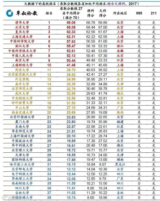 那我们还是从2017年录取分数线这个角度出发,按照录取分数线来看,复旦和上交在62分左右,而第5的国科大在57分左右,所以从这个角度,全国第三高校的宝座,还是要从复旦和上交里面选一个的。文理科加权综合得分来看,复旦和上交都是62.3分,基本上是没有差距的,当然一定要精确到小数点两位之后的话,复旦62.33分,上交62.31分,复旦是全国第3,上交是全国第4。